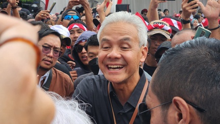 Pasangan bakal calon presiden (bacapres) Ganjar Pranowo dan bacawapres Mahfud MD menyapa para pendukung di Tugu Proklamasi, Jakarta. Terlihat Ganjar didampingi istrinya, Siti Atikoh mengenakan pakaian hitam.