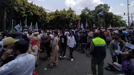 Pendukung pasangan bakal capres-cawapres, Anies Baswedan dan Muhaimin Iskandar atau akrab disapa Cak Imin diminta bergeser dan meninggalkan Gedung KPU RI, Jakarta Pusat. Permintaan itu diserukan para sejumlah orator yang berada di beberapa mobil komando.