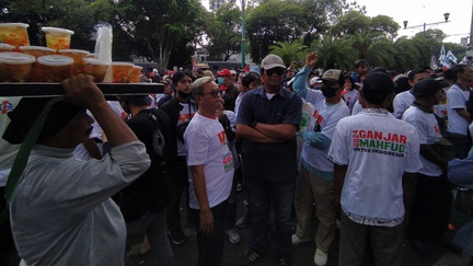 Pendukung pasangan Ganjar Pranowo dan Mahfud MD telah berdatangan di depan Gedung KPU RI, Jakarta Pusat, Kamis (19/10/2023).