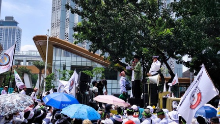 Para guru yang berdemo itu cerita ada yang terpaksa kerja sampingan menjadi sales motor karena minimnya besaran gaji guru madrasah swasta.