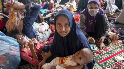 tirto.id - Puluhan pengungsi etnis Rohingya asal Myanmar terobang-ambing di atas sebuah kapal yang tak layak di perairan Aceh Utara, Rabu (24/6/2020). Meski otoritas setempat belum memberikan izin, atas dasar kemanusiaan serta kondisi yang memprihatinkan, sekitar 94 orang pengungsi terdiri dari 15 orang laki-laki, 49 perempuan dan 30 anak-anak dievakuasi oleh nelayan setempat menggunakan kapalnya menuju daratan. Sesampainya di pantai Lancok, Kecamatan Syantalira Bayu, Aceh Utara pada Kamis (25/6/2020), para pengungsi diberi makan, perawatan hingga menjalani tes cepat COVID-19. Hingga saat ini Pemerintah Daerah masih berkoordinasi untuk memenuhi kebutuhan logistik para pencari suaka tersebut. ANTARA FOTO/RAHMAD