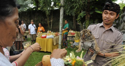 Umat Hindu memperingati hari Tumpek Kandang atau hari suci khusus untuk binatang peliharaan di Bali Zoo, Gianyar, Sabtu (26/11).