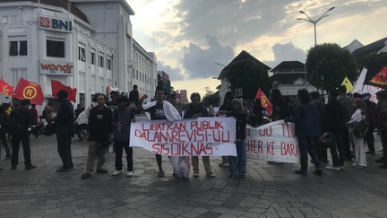 Penolakan Soeharto jadi pahlawan nasional disuarakan dalam aksi yang berpusat di Titik Nol Kilometer dan Museum TNI AD Dharma Wiratama.