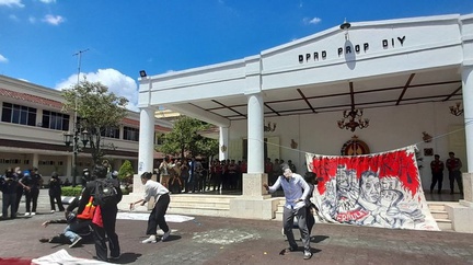Aliansi Jogja Memanggil menggelar aksi menolak pengesahan Undang-Undang TNI di halaman gedung DPRD DIY, Kamis (20/3/2025) siang.