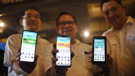Direktur Utama PT Mapel Teknologi Indonesia Gunawan Liento (kanan), bersama Direktur Operasional Tommi P M Hutapea (tengah), serta Direktur Finance Nino Osamulia (kiri), menunjukan aplikasi market place Mapel.co.id seusai diluncurkan di Jakarta, Minggu (15/3/2020).