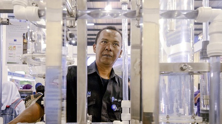 Peneliti memeriksa perangkat penyaring limbah tambang yang dipamerkan di Indonesia Science Expo 2017.