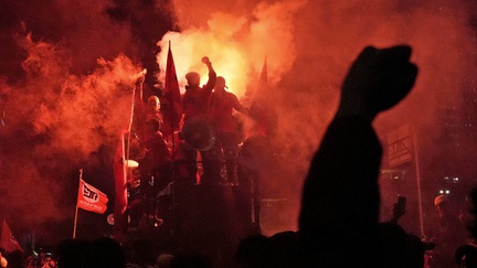 Hingga Selasa (13/9/2022) malam, pengunjuk rasa di Jalan Medan Merdeka Barat, Jakarta Pusat menyalakan suar api dan membakar spanduk sebagai bentuk protes atas kebijakan pemerintah menaikan tarif BBM bersubsidi.