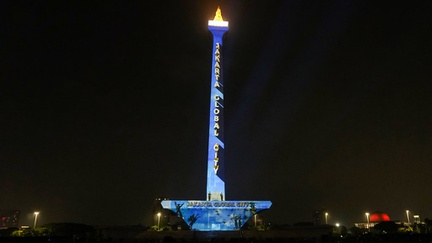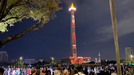 Warna merah yang terpancarkan dari video mapping yang disorotkan ke arah tugu Monas sangat menonjol.