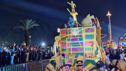 Warga bersemangat melihat pertunjukan parade Jakarnaval untuk memeriahkan perayaan malam tahun baru 2024.