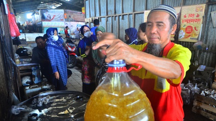 Pedagang di Pasar Slipi, Syawal mengaku khawatir penggunakan PeduliLindungi dapat mempersulit dalam menjual minyak goreng curah.