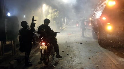 Perisai anti huru-hara disiagakan di kantor LBH Jakarta dua hari setelah kericuhan terjadi, Jakarta.