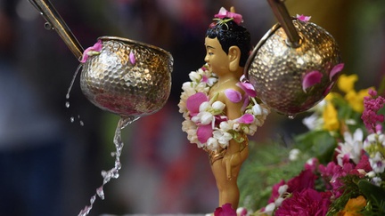 Masyarakat bersorak ketika para biksu mencipratkan air berkah sembari berdoa.
